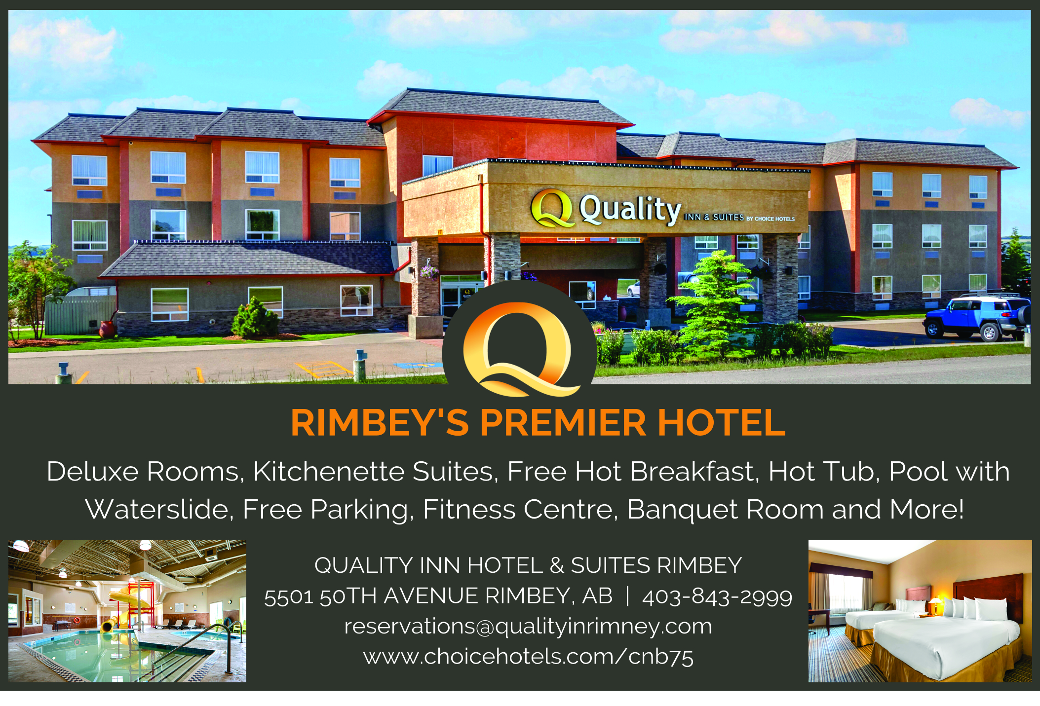 If you are planning to visit the town of Rimbey, AB, stay at our modern hotel. Quality Inn is conveniently located at Highway 53, which is 2.6 miles from the Central Alberta Raceway, 14 miles from Parkland Beach on Gull Lake, and 16.4 miles from the Medicine Lodge Ski Area. Also close to Downtown, Shopping, Sports Venues, Community Centre, Rimbey Rodeo, Hospital & Medicial Services, Parks and Outdoor Adventures.